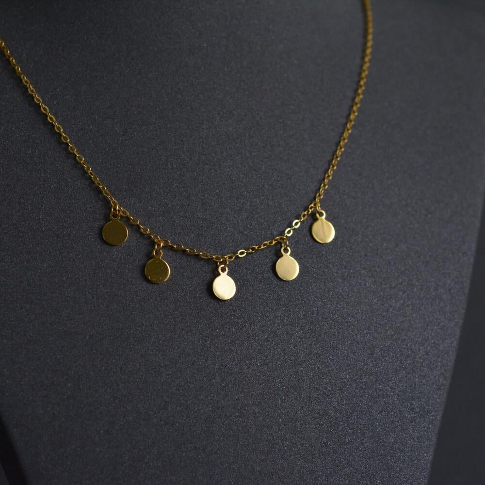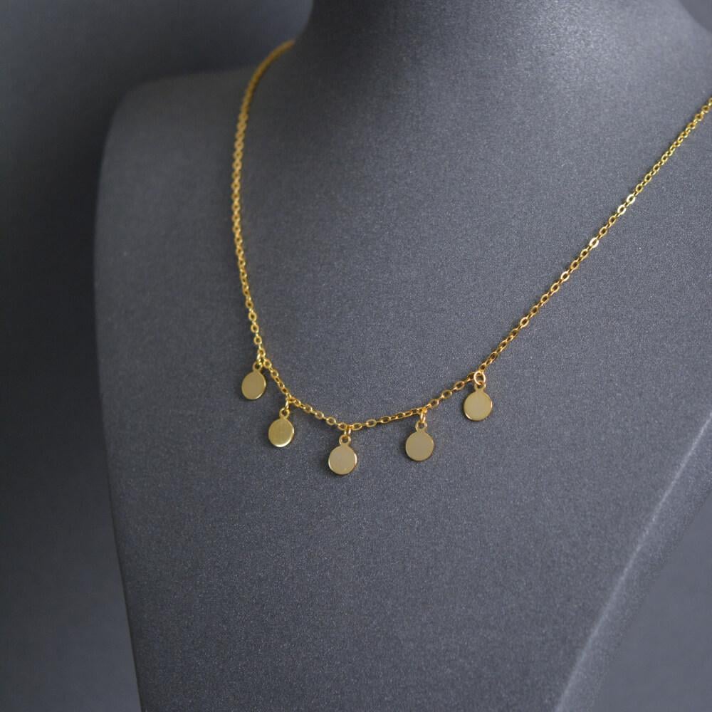 السلسلة تتكون من حلقات دقيقة تحمل خمس تعليقات دائرية صغيرة متدلية بشكل متناسق، مما يمنحها لمسة عصرية ومثالية للإطلالات اليومية أو المناسبات الخاصة. التصميم يعكس البساطة مع الأناقة، وهو خفيف الوزن ومناسب للارتداء الطويل.